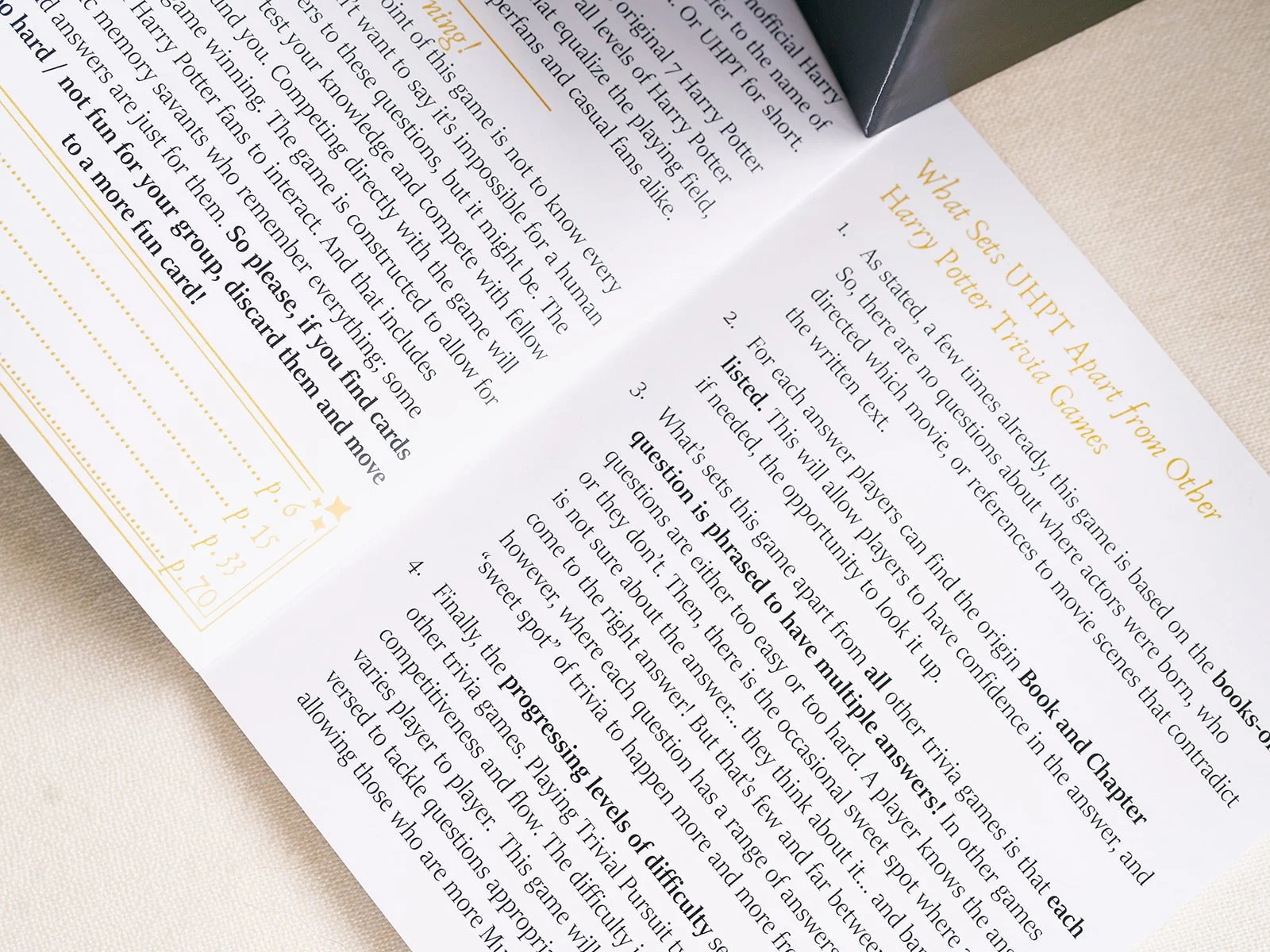 UHPT is a card deck trivia game based on the original 7 Harry Potter novels. The intent is to be appropriate for all levels of Harry Potter fandom. There are many playing styles that equalize the playing field, keeping games even between the superfans and casual fans alike!